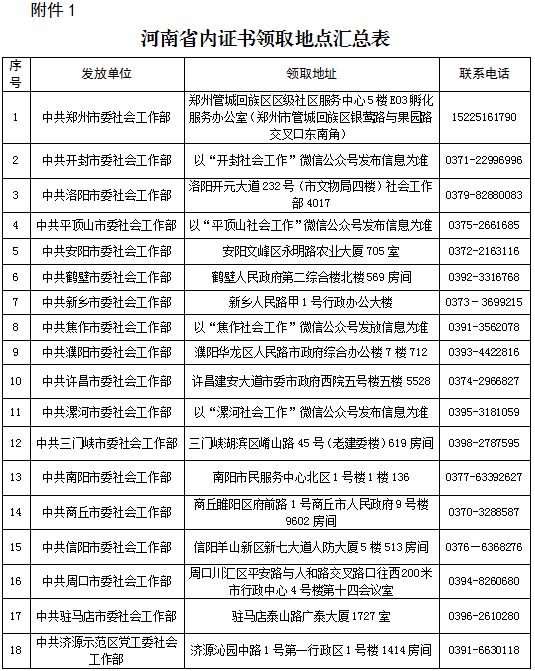 证书由考试报名地的省辖市(济源示范区)负责发放,报名地点与常驻地不一致的考生,可与报考地党委社会工作部联系确认领证地点。省直和航空港区考生证书由中共郑州市委社会工作部代为发放。各地领取地址、联系方式详见附件1。