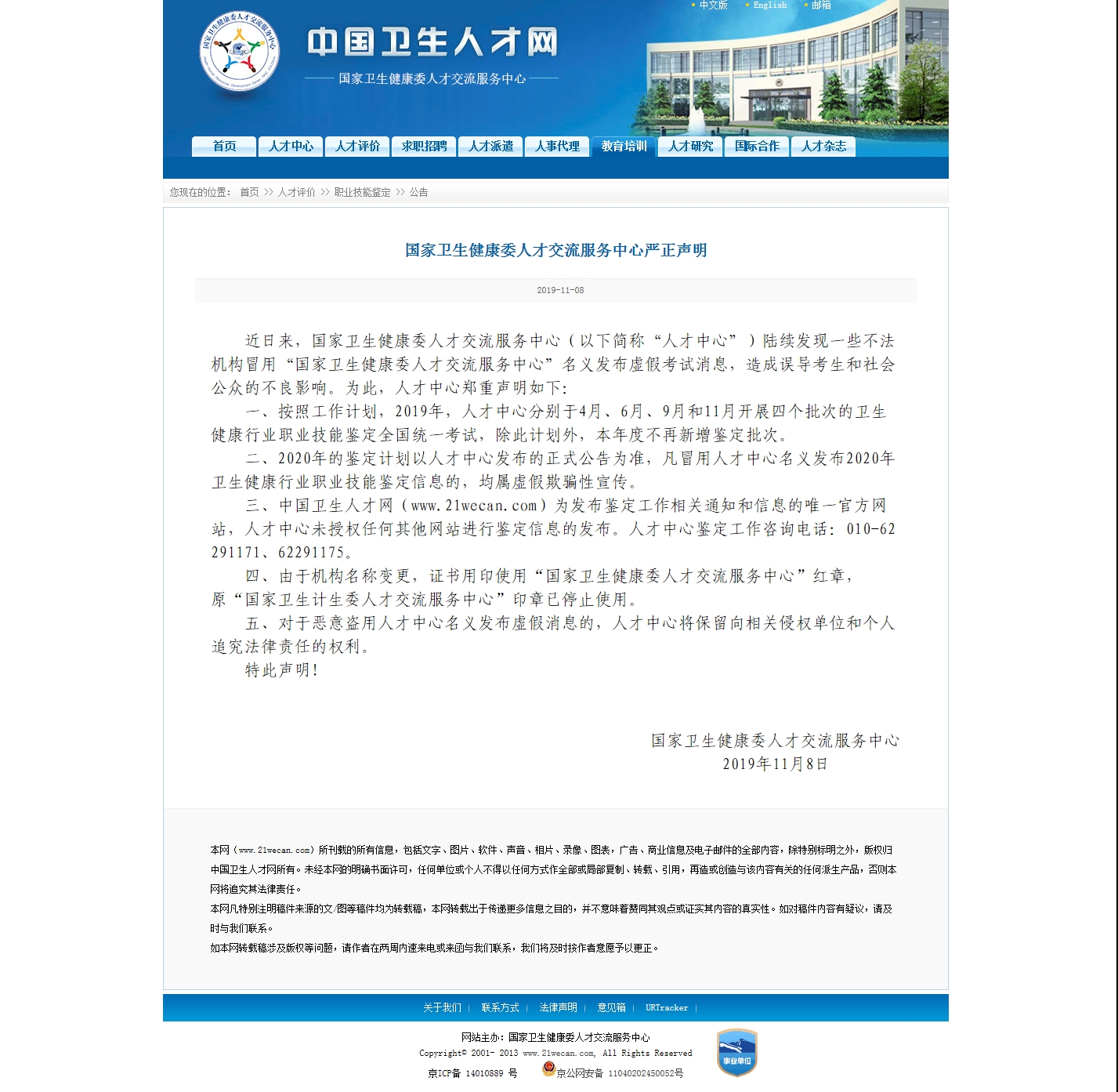 近日来,国家卫生健康委人才交流服务中心(以下简称“人才中心”)陆续发现一些不法机构冒用“国家卫生健康委人才交流服务中心”名义发布虚假考试消息,造成误导考生和社会公众的不良影响。为此,人才中心郑重声明如下: